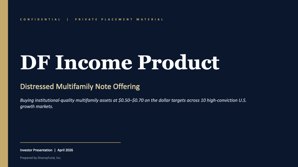 Slide 1 of 16: Cover — DF Income Product, distressed multifamily note offering